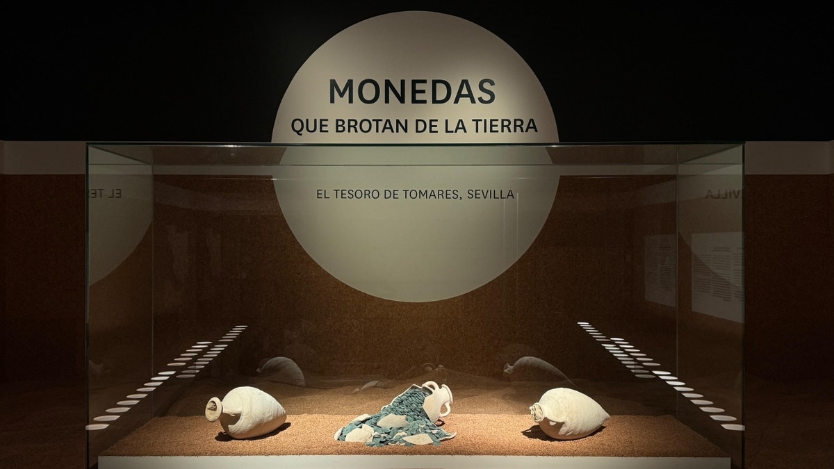 Exhibit photos show the ancient coins spilling from the fragmented amphora, which has remarkably preserved some of its features over the centuries, including its handles.