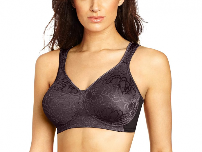 This bra helps cover those unwanted back bulges with its stretchy satin material, and the cushioned straps relieve pressure and don’t dig in or slide off, leaving you free and easy for up to 18 hours. It comes in sizes 34C to 54DDD and in multiple colors.